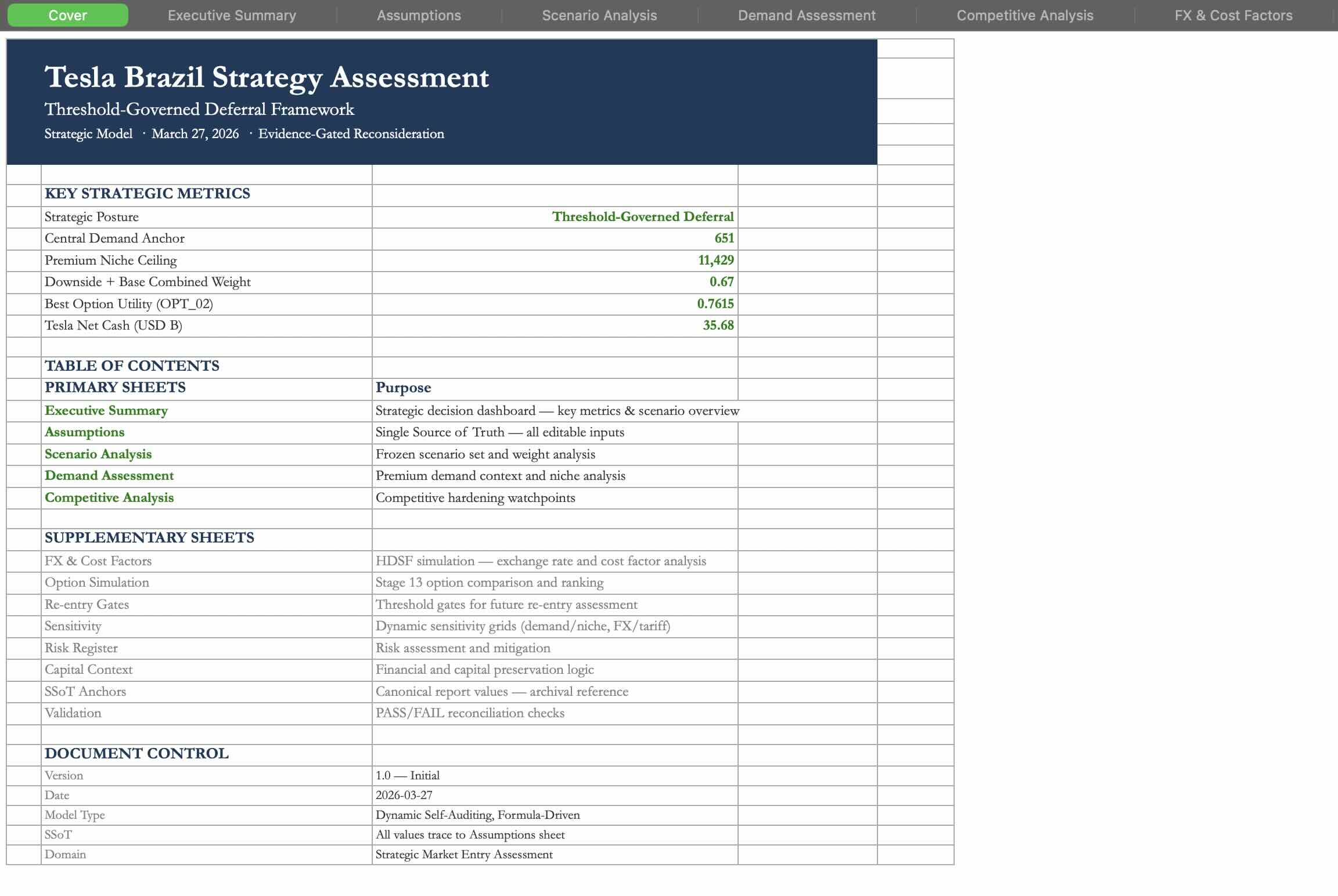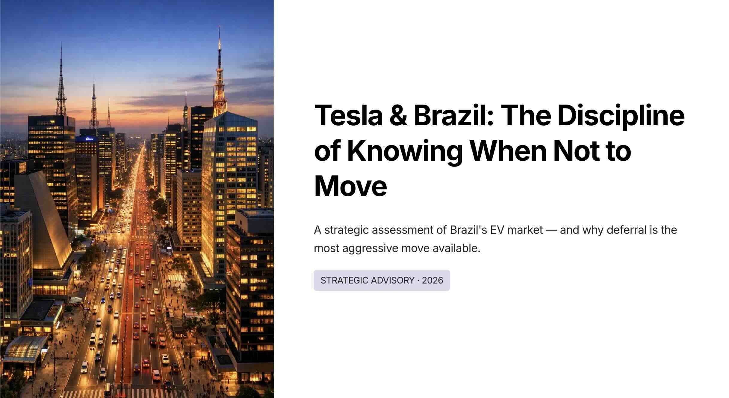 As of March 2026, determine whether Tesla should enter Brazil now, later, conditionally, or not at all. Do not assume entry is correct. Evaluate Brazil as a skeptical top-tier strategy firm would: market attractiveness, demand quality, premium EV fit, tariffs, localization requirements, competitive pressure, charging/ service readiness, regulatory risk, FX/macroeconomic exposure, operating complexity, and likely economics versus alternative uses of capital. Compare import-led entry, partner-led entry, CKD/SKD assembly, and recommend the single best path only if it is strategically and economically defensible; otherwise recommend deferral or no-go. Then provide a stage-gated 24-36 month implementation plan from board approval with milestones, decision gates, trigger conditions, operating model, capital requirements, contingencies, and explicit kill criteria. Red-team the recommendation and identify the strongest reasons Tesla should not do it.